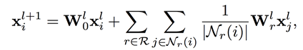 其中,代表节点在第层的特征向量, 和 为可学习的参数,代表rating(一般从 中选择,代表与节点以类型边相连的邻居节点。