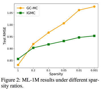 对于ML-1M数据集,我们分别将训练矩阵稀疏为0.2, 0.1, 0.05, 0.01和0.001倍。Figure 2比较了GC-MC和IGMC在不同稀疏程度下的性能对比。我们发现,虽然IGMC在sparsity=1时落后于GC-MC,但是此后IGMC在不同sparsity下都优于GC-MC,而且矩阵越稀疏,性能优势越明显。我们猜测,基于子图特征学习的IGMC对稀疏矩阵更鲁棒;而基于矩阵分解等的转导模型需要矩阵较为致密(dense)才能有好的性能。这也暗示了IGMC在数据稀疏的推荐系统中的潜力。