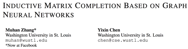 本文介绍的是ICLR2020入选论文《INDUCTIVE MATRIX COMPLETION BASED ON GRAPH NEURAL NETWORKS》(基于图神经网络的归纳矩阵补全)。文章来自华盛顿大学圣路易斯分校博士、Facebook AI 研究院研究科学家张牧涵。