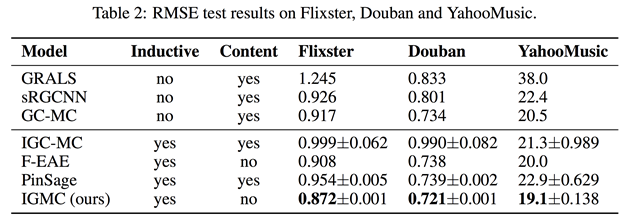 我们仅使用一阶包含子图训练IGMC。首先,在Table 2中我们展示了在Flixster, Douban和YahooMusic上的RMSE性能。我们的IGMC模型取得了state-of-the-art性能,超过了近期的其他基于图神经网络的模型。