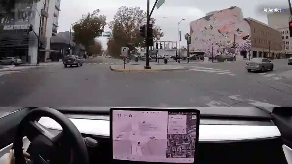 在一个晴朗的日子里,一辆搭载了 FSD Beta 的特斯拉以每小时 15 英里的速度右转通过圣何塞的一个十字路口。一条自行车道位于道路内侧。然后,车就以每小时 11 英里的速度撞上了自行车道的保护柱。