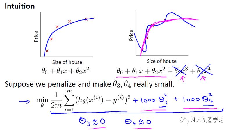 1000 只是我随便写的某个较大的数字而已。现在,如果我们要最小化这个函数,那么为了最小化这个新的代价函数,我们要让 θ3 和 θ4 尽可能小。因为,如果你在原有代价函数的基础上加上 1000 乘以 θ3 这一项 ,那么这个新的代价函数将变得很大,所以,当我们最小化这个新的代价函数时, 我们将使 θ3 的值接近于 0,同样 θ4 的值也接近于 0,就像我们忽略了这两个值一样。如果我们做到这一点( θ3 和 θ4 接近 0 ),那么我们将得到一个近似的二次函数。