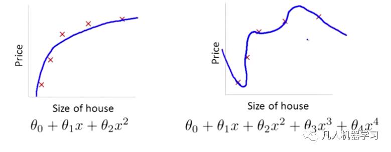 如果我们这么做,那么就是我们的假设中相当于去掉了这些项,并且使我们只是留下了一个简单的假设,这个假设只能表明房屋价格等于 θ0 的值,那就是类似于拟合了一条水平直线,对于数据来说这就是一个欠拟合 (underfitting)。这种情况下这一假设它是条失败的直线,对于训练集来说这只是一条平滑直线,它没有任何趋势,它不会去趋向大部分训练样本的任何值。