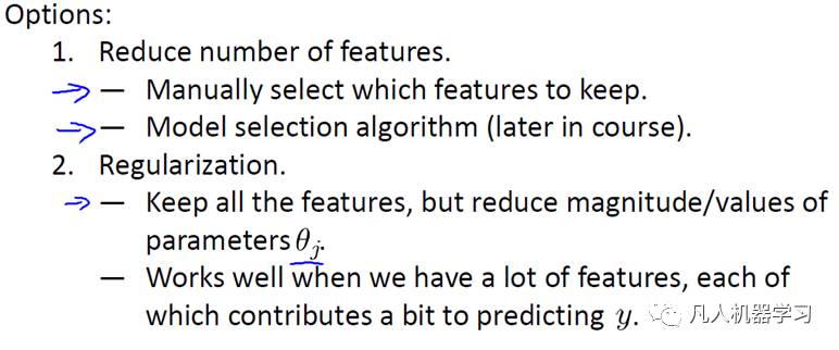 过多的变量(特征),同时只有非常少的训练数据,会导致出现过度拟合的问题。因此为了解决过度拟合,有以下两个办法。