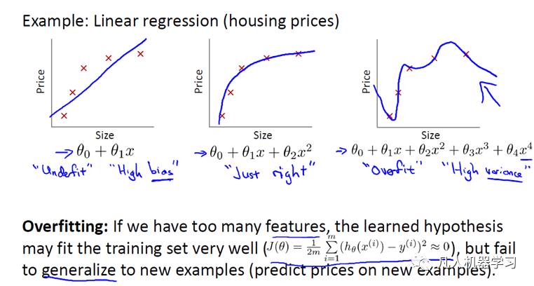 这两种说法大致相似,都表示没有很好地拟合训练数据。高偏差这个词是 machine learning 的研究初期传下来的一个专业名词,具体到这个问题,意思就是说如果用线性回归这个算法去拟合训练数据,那么该算法实际上会产生一个非常大的偏差或者说存在一个很强的偏见。