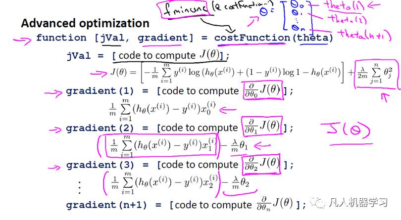 如果在高级优化算法中,使用正则化技术的话,那么对于这类算法我们需要自己定义costFunction。