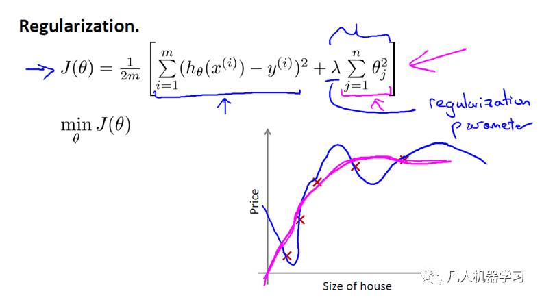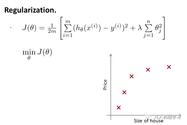 对于我们的房屋价格预测来说,我们之前所用的非常高的高阶多项式来拟合,我们将会得到一个非常弯曲和复杂的曲线函数,现在我们只需要使用正则化目标的方法,那么你就可以得到一个更加合适的曲线,但这个曲线不是一个真正的二次函数,而是更加的流畅和简单的一个曲线。这样就得到了对于这个数据更好的假设。