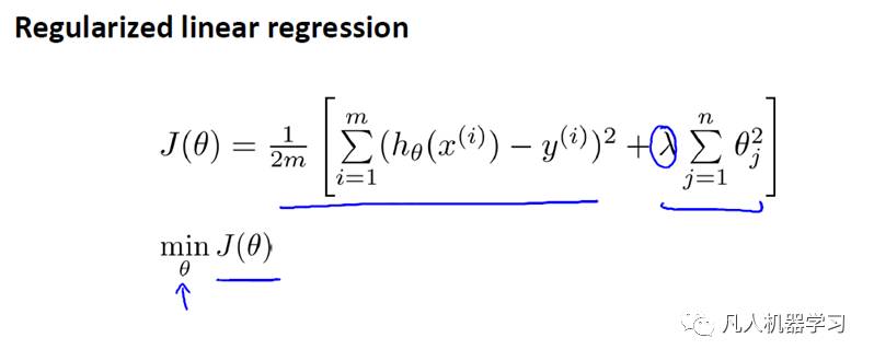 因此在正则化里,我们要做的事情,就是把减小我们的代价函数(例子中是线性回归的代价函数)所有的参数值,因为我们并不知道是哪一个或哪几个要去缩小。
