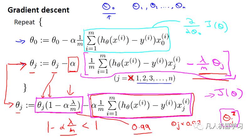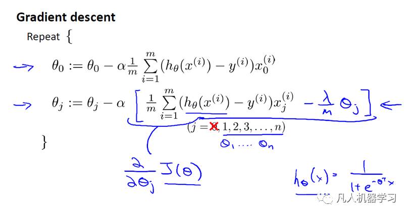 因此,我们需要修改代价函数,在这后面添加一项,就像我们在方括号里的这项。当我们添加一个额外的正则化项的时候,我们收缩了每个参数。