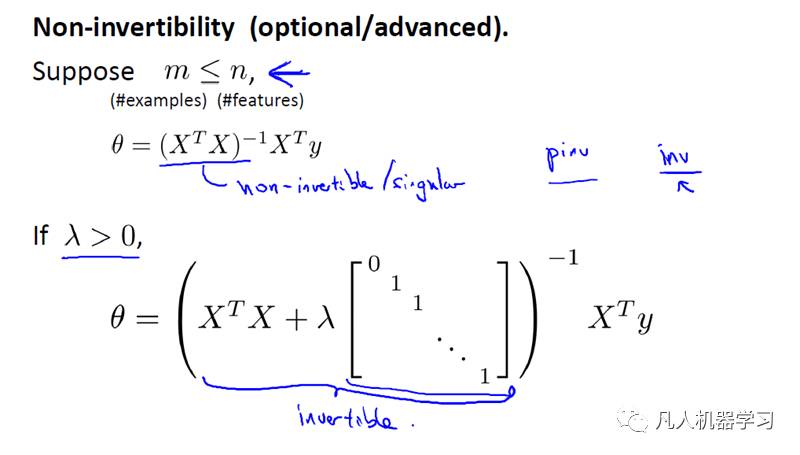 通过之前的博文,我们知道如果你只有较少的样本,导致特征数量大于样本数量,那么矩阵 XTX 将是不可逆矩阵或奇异(singluar)矩阵,或者用另一种说法是这个矩阵是退化(degenerate)的,那么我们就没有办法使用正规方程来求出 θ 。