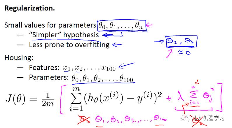 更一般地,这里给出了正规化背后的思路。这种思路就是,如果我们的参数值对应一个较小值的话(参数值比较小),那么往往我们会得到一个形式更简单的假设。