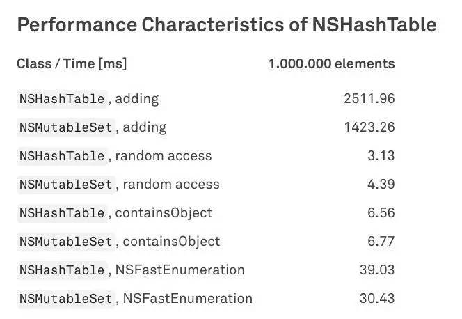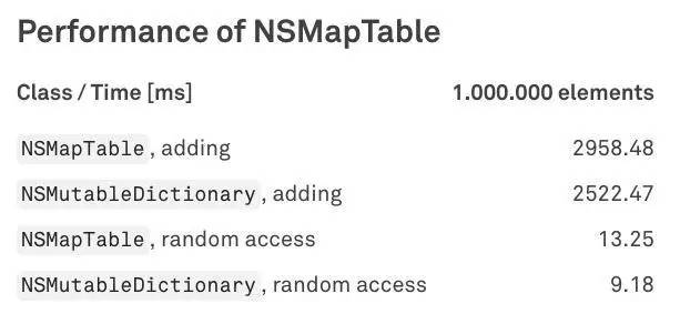 这个方案应该是最简单的了,毕竟是苹果Foundation框架里封装的高级对象。但是其缺点是性能相比对应强引用容器在性能上有所欠缺,根据Objc.io文章中的测试结果,NSHashTable的addObject和NSPointerArray的addPointer性能差距尤其严重,使用时需要注意。