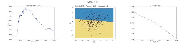 左图:准确率;中间的图:学习到的决策边界;右图:损失函数