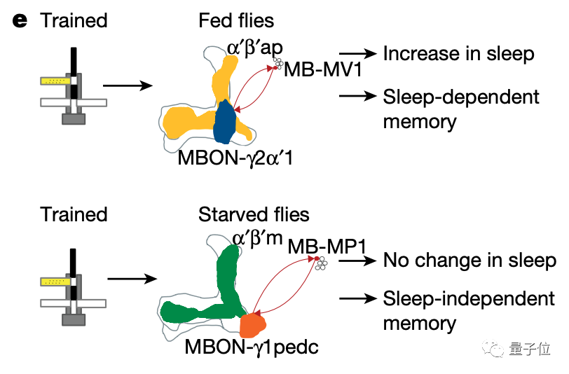 研究发现,在吃饱时,果蝇的记忆由蘑菇体前后α’/β’神经元介导,而饥饿时的记忆则由蘑菇体中间的α’/β’神经元介导。