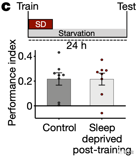 相比之下,饿着肚子的果蝇,无论睡不睡,都不会对记忆产生太大的影响。(反正都已经饿着肚子,睡眠就显得没有那么重要了?)