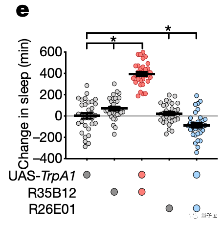 科学家们对几种有明显变化的物质采取了排除法,发现在饥饿状态下,神经元产生的信号(图中蓝色)和在吃饱状态下,神经元产生的信号(图中红色),会对睡眠产生完全不同的影响。