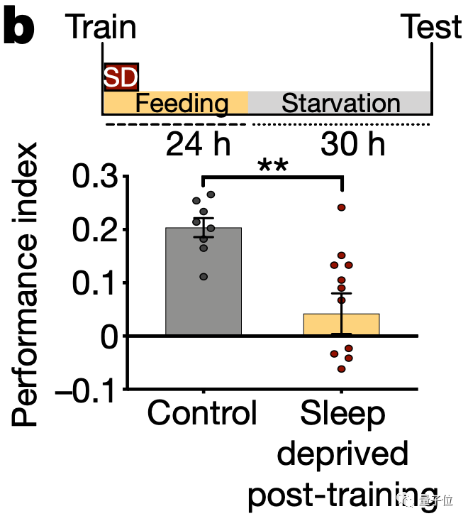 实验发现,果蝇在饥饿时,无论受不受训练(通过嗅觉反射训练,强制形成某种记忆),睡眠时间都没有明显变化。