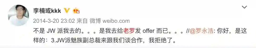 黄章对老罗的营销能力还是比较肯定的,双方曾经谈过合作。不过这场由李楠出面进行的洽谈,老罗形容它是「黄章派魅族副总裁找我谈合作」,李楠却表达出一种「你不配让黄章出面我是自己去给你发个 offer而已」的意思,双方搞得很不愉快。