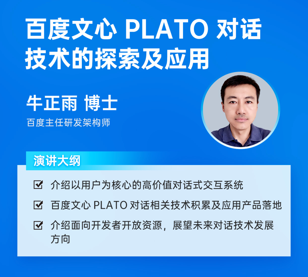 演讲嘉宾履历简介:牛正雨博士,现任百度自然语言处理部主任架构师,负责通用对话方向(北京团队)的技术研发与应用。曾参与百度知识图谱构建、搜索 query 分析等项目,至今已发表学术论文四十余篇,作为项目成员曾获得 2017 年度中国电子学会科技进步一等奖。