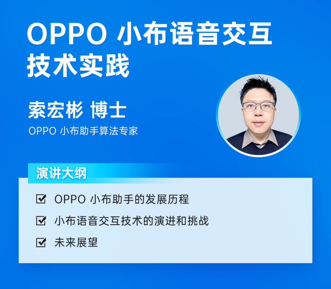 演讲嘉宾履历简介:索宏彬博士,OPPO 小布助手算法专家,CCF 会员,曾在中国科学院、联想研究院、阿里达摩院工作,学术论文发表超过 40 篇,语音技术专利 30 项。近年来主要从事个性化语音交互、语音唤醒、语音识别和副语言属性识别算法研究与落地应用工作,2022 年加入 OPPO 主导语音技术研发工作,帮助公司级战略产品小布助手实现月交互突破 30 亿次。