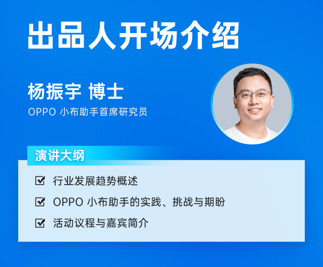 演讲嘉宾履历简介:杨振宇博士,OPPO 小布助手首席研究员,CCF 高级会员,曾在国防科大等高校任教,学术论文代表作单篇他引超过 800 次,入选 ESI Top 0.1%。近年来主要从事自然语言处理、对话式 AI 相关算法研究与落地应用工作,2018 年加入 OPPO 主导 NLP 与对话相关工作,帮助公司级战略产品小布助手实现月活突破 1.4 亿。