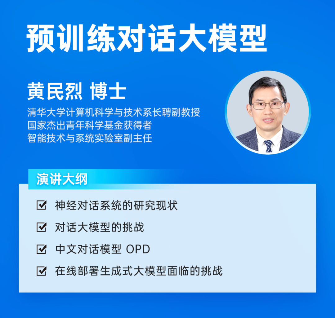 演讲嘉宾履历简介:黄民烈博士,清华大学计算机科学与技术系长聘副教授,国家杰出青年科学基金获得者,智能技术与系统实验室副主任。主要研究方向为自然语言生成、对话系统、阅读理解等。曾获得中国人工智能学会吴文俊人工智能科技进步奖一等奖(第一完成人),中文信息学会汉王青年创新奖,阿里巴巴创新合作研究奖。发表国际顶级会议或期刊论文超过 100 篇,获得专利授权 10 余项,5 次获得国际主流会议的最佳论文或提名(IJCAI、ACL、SIGDIAL 等),著有国内第一本关于自然语言生成的著作《现代自然语言生成》。研发对话系统平台 ConvLab 和 ConvLab2,首个中文开放域对话预训练模型 CDial-GPT,中文开源对话模型 EVA,首个情感对话机器人 Emohaa。