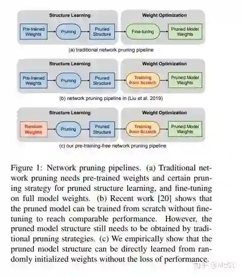 论文的作者提出了一个允许网络from scratch剪枝的流程。 对 CIFAR10和 ImageNet 数据集进行的压缩分类模型实验证明了这个流程减少了常规剪枝方法的预训练开销,并提高了网络精度。