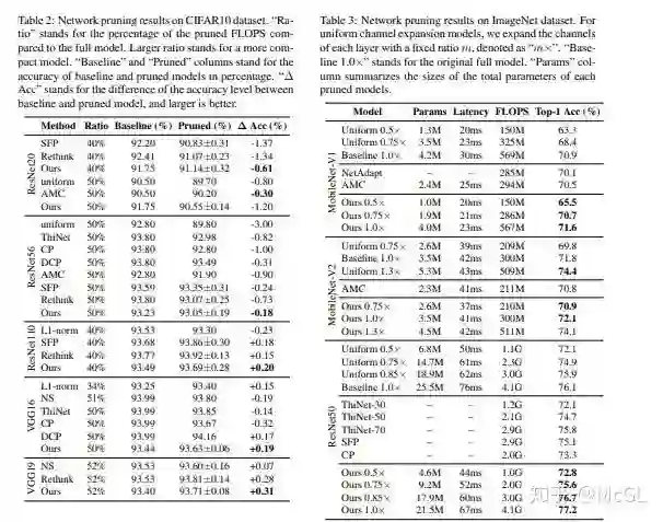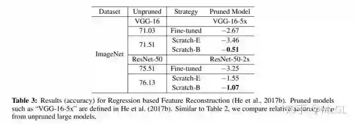 下表显示了基于回归的特征重建所得到的结果。 该方法通过最小化下一层feature map 的重建误差来剪掉channels。 这个最佳化问题是通过 LASSO 回归解决的。