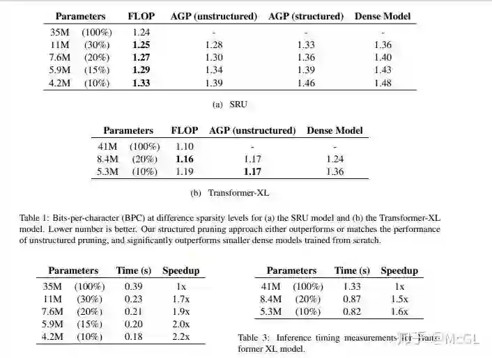 使用的字符级语言模型是 enwik8数据集,其中包含来自 Wikipedia 的100M 字节数据。 在 SRU 和 Transformer-XL 上对 FLOP 进行了评估,得到的结果如下所示。
