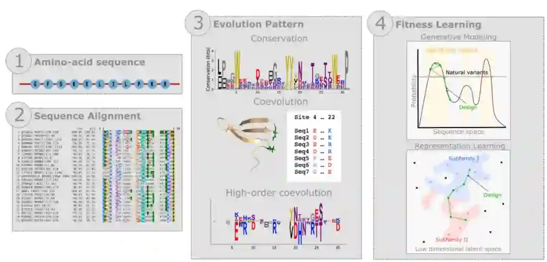 基于进化的设计包括三个主要步骤:(i)收集和比对一组与野生型蛋白同源的序列,这些序列具有相似的结构和功能,(ii)构建统计/机器学习模型,该模型捕获这些序列之间共享的共同模式,例如保守和共同进化,以及(iii)生成不同于自然序列但保留共同模式的人工序列。