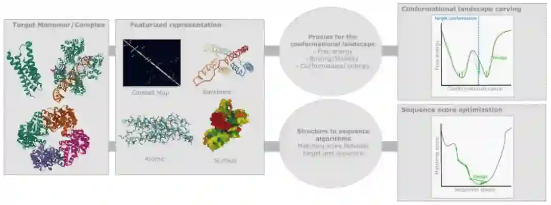 基于进化的方法,前者推断具有所需结构或功能的蛋白质序列集合共享的序列特征。后者使用机器学习surrogates估计关键生化特性,例如结构自由能、构象熵或结合亲和力。