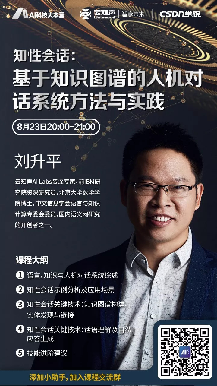 在本期公开课课程中,AI 科技大本营邀请到了云知声 AI Labs 资深专家刘升平针对“基于知识图谱的人机对话系统方法与实践”做系统的讲解和梳理。