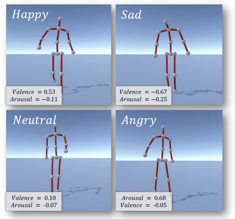 头部倾斜角度被用来区分快乐和悲伤的情绪,而“身体紧张”和“身体舒张”分别识别积极和消极的情绪。至于情绪平静还是精神充沛,研究人员注意到它往往与运动量是否增加相对应,该模型考虑了速度、加速度的大小,以及手、脚和头部关节的“运动抖动”。