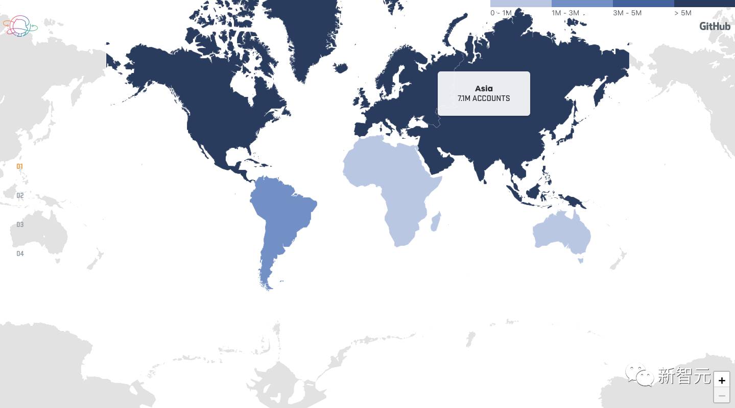GitHub 的2400万用户遍布全世界200多个国家。下面这张地图显示了哪个大陆使用GitHub的人数最多。
