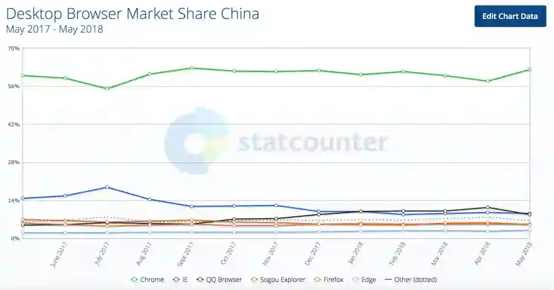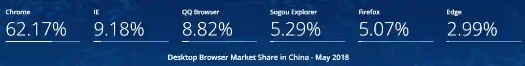 该监测机构还分别对部分国家的数据进行了统计。中国的桌面浏览器市场依然被 Chrome 统治,然后是 IE ,以及相对具有本土特色的 QQ 浏览器和搜狗浏览器。Firefox 以 5.07% 的成绩位居第五名,相比四月份下降了 0.66 个百分点。