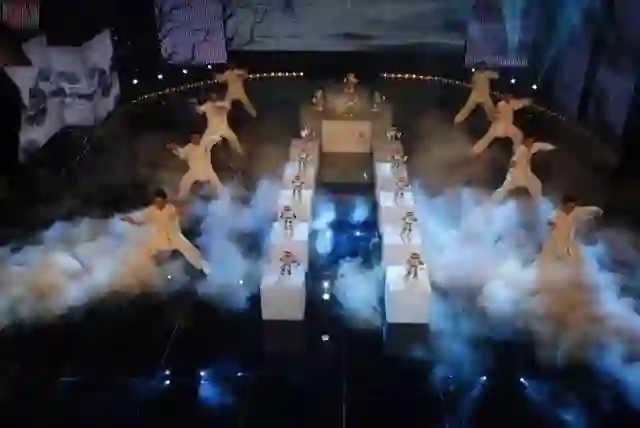 “卧似一张弓,站似一棵松”...... 在中国功夫的歌曲中,14台Dobi机器人舞乐起舞,和8位太极拳高手比划起了拳脚。挥拳、劈腿、高抬腿,机器人架势十足。接上一曲欢快的霍元甲,配合太极拳高手们舞刀弄剑,展现了机器人刚柔并济的气质。
