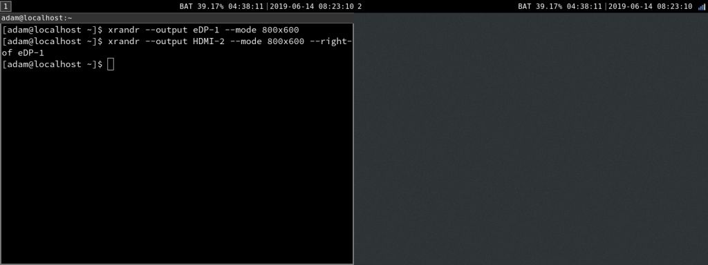 这个例子显示了笔记本电脑的主屏幕(名为 eDP1),以及连接到 HDMI-2 输出的第二个显示器,它位于笔记本电脑的右侧。要打开它,请运行以下命令: