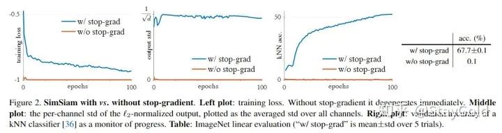 第二张图显示了输出表示的方差,如果没有stop-grad,方差近乎为0(发生了坍缩);而使用stop-grad能让方差为 ,差不多就是表示均匀分散在