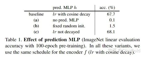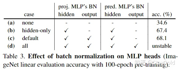 上图验证了BN的效果,实验证明在projection(ResNet内)网络中的隐层和输出层,在predictor网络中的隐层加BN效果最好。