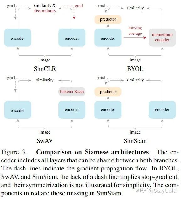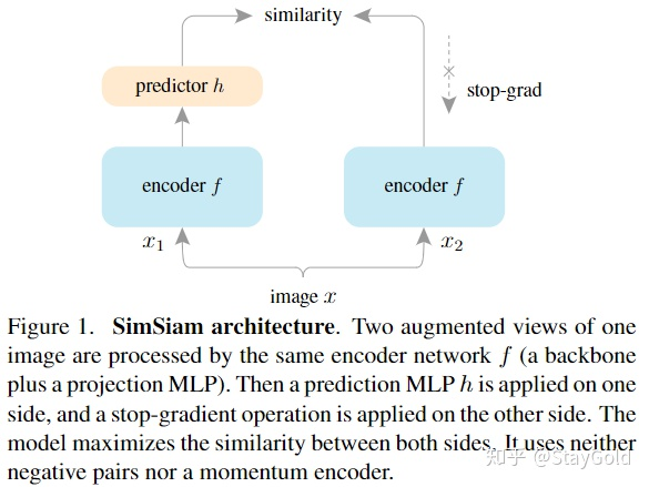 本文证明了即使没有上面三个策略,简单的孪生网络(称为SimSiam)也能达到类似的效果,只需要一个stop-gradient的操作。