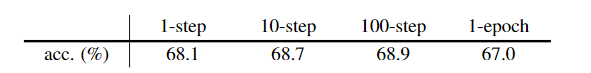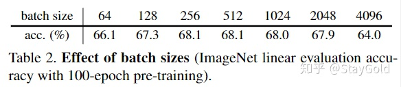 上图验证了batch size的影响,在256和512上获得了最好的效果,过大的batch size反而会损害性能,显示了本方法不依赖于过大的batch size。