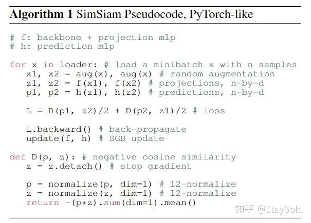 一个非常重要的、能让模型work的操作是stop-gradient操作,作者使用 来表示这一操作,这样,上面的两个损失分别变成了: