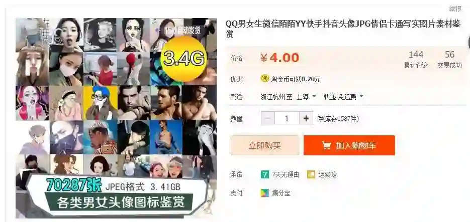 张天卓一年前下载了探探,并如实上传了本人照片,一直没人搭理。朋友提醒可能是颜值原因,建议他到淘宝上买套好看的男生“生活套图”,他点开链接后眼界大开——数千款好看的年轻男女生活照成套售卖,一套照片含有同一个人的数十张生活照,淘宝定价一套仅售4元,可谓物美价廉。