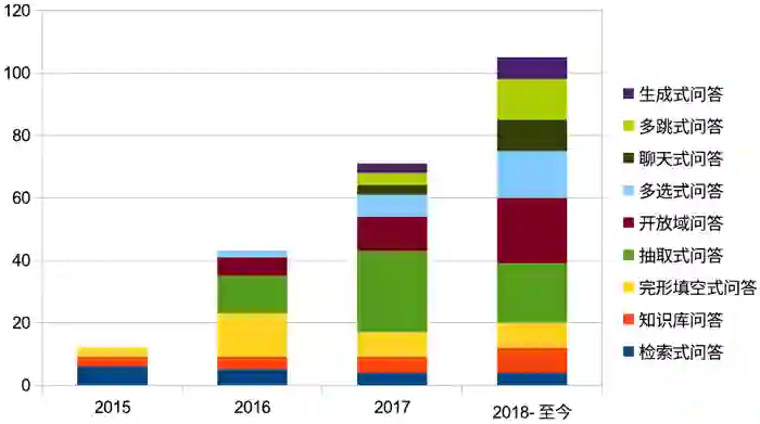 ▲ 图1. 近年来基于深度学习的文本问答学术论文数量随年份变化情况统计(数据统计于ACL、EMNLP、NAACL、NIPS、AAAI等各大顶级学术会议)