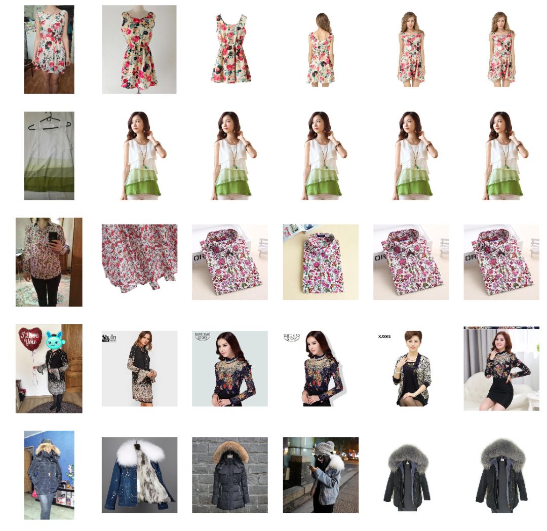 结果:第一列-查询(用户图像),后五列-最相似的卖家图像。