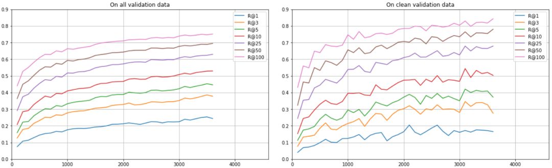 正如我之前讲到的,我从噪声图像中清洗了一部分用户图像。所以我在两个验证集上衡量了一下模型的质量:完整的验证集只包含干净数据的子验证集。