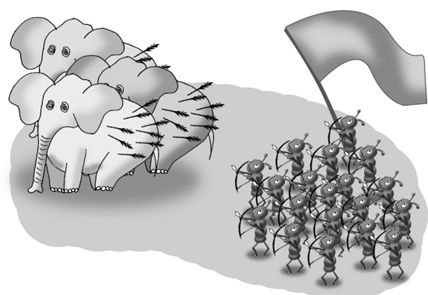 一群蚂蚁爬上大象的背,大象抖落了大部分,只剩下一只,死死咬住大象的脖子。底下的蚂蚁大叫:掐死他,掐死他!狗丫的,还治不了你!