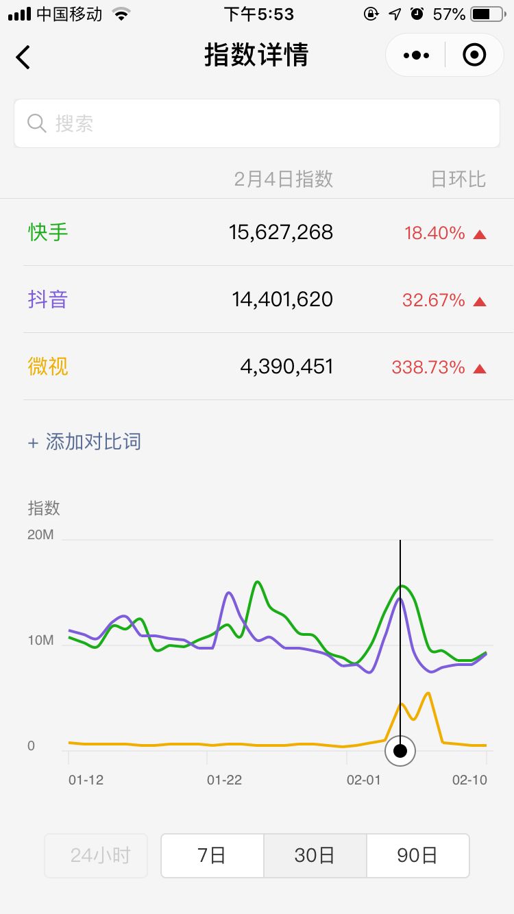从效果看来,三大平台微指数均呈现出小高峰,尽管指数悬殊依旧,但微视的日环比达338.73%,是抖音的整整10倍。