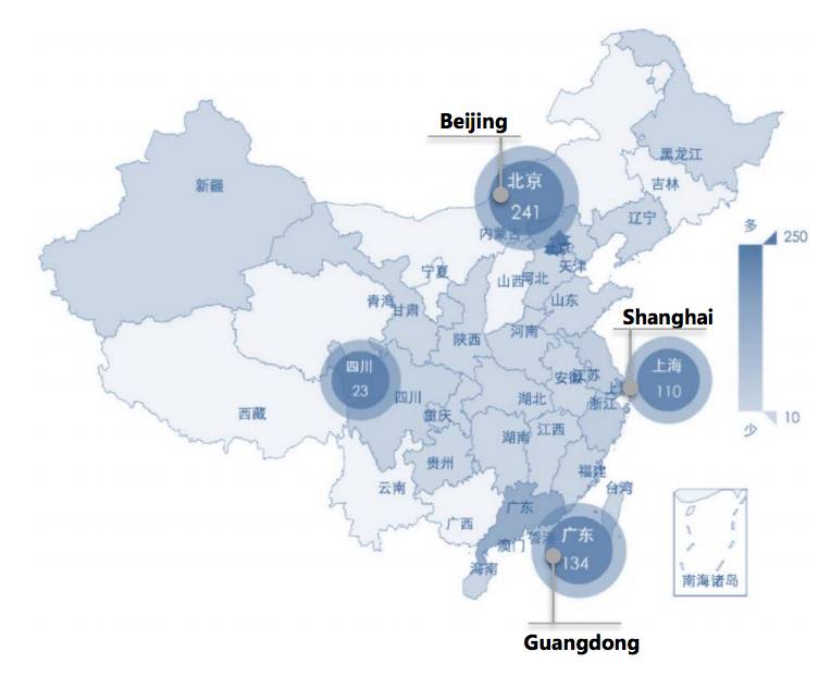 中国的人工智能创业公司主要集中于北京、广东和长江三角洲经济区域。