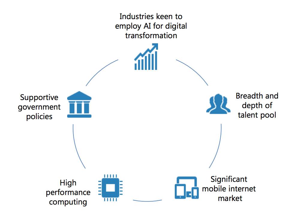 五大因素促使中国发展成为全球 AI 中心:(1)多个行业希望利用 AI 实现数字化转型;(2)大量人工智能高端人才;(3)移动互联网市场前景广阔;(4)高性能计算技术;(5)政府政策支持。其中,前两个因素尤为重要,是中国发展成为全球 AI 中心的独特优势。